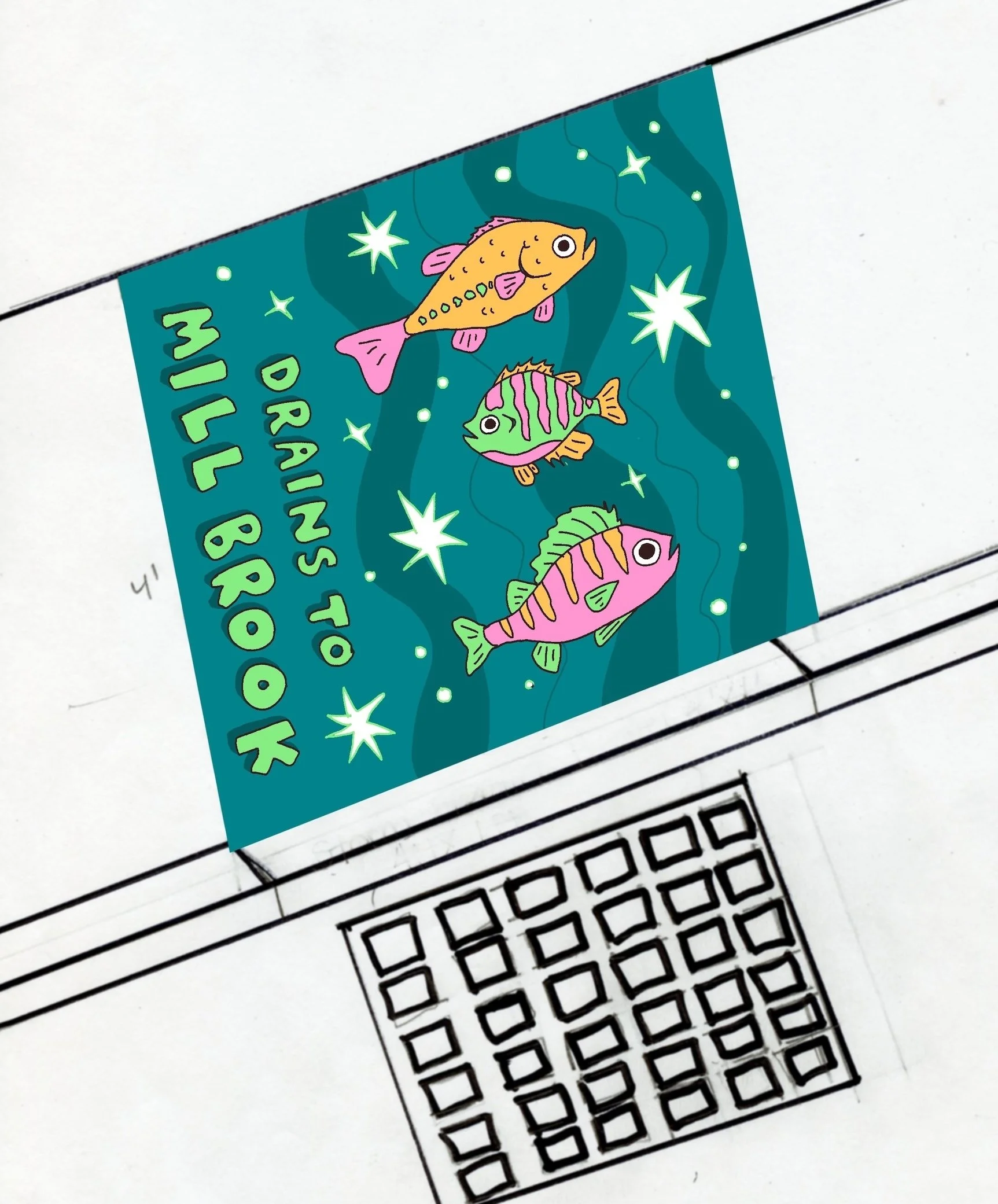 This mural was commissioned by the Town of Arlington, MA through the Arts Arlington committee. The Storm Drain Awareness murals inform folks about their local waterways, which helps reduce unlawful and harmful dumping and contamination of fragile local ecosystems such as the Alewife Brook.